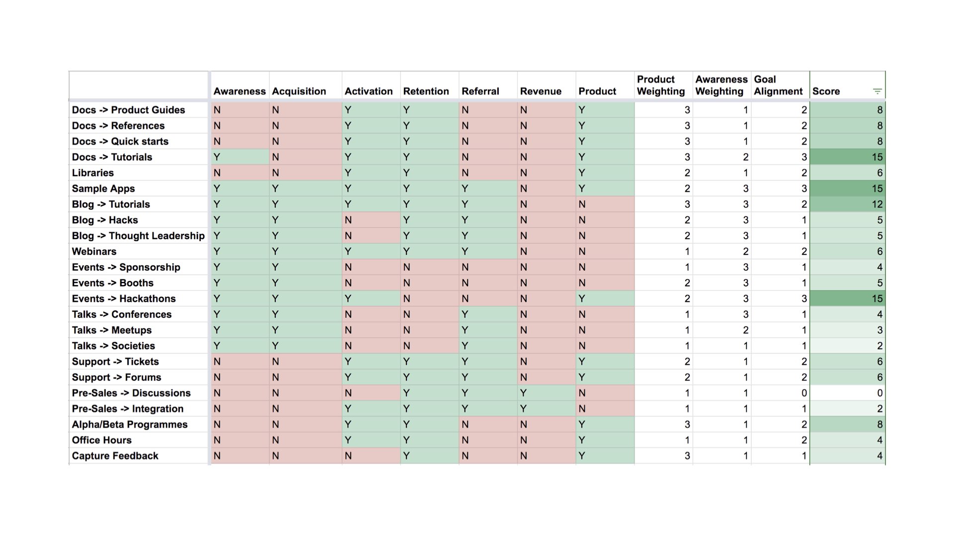 Often the work you will do depends on overall company goals and your potential impact. As the business grows and Developer Relations grows, you will establish more team wide goals, but even those will depend on company goals in order to be successful.