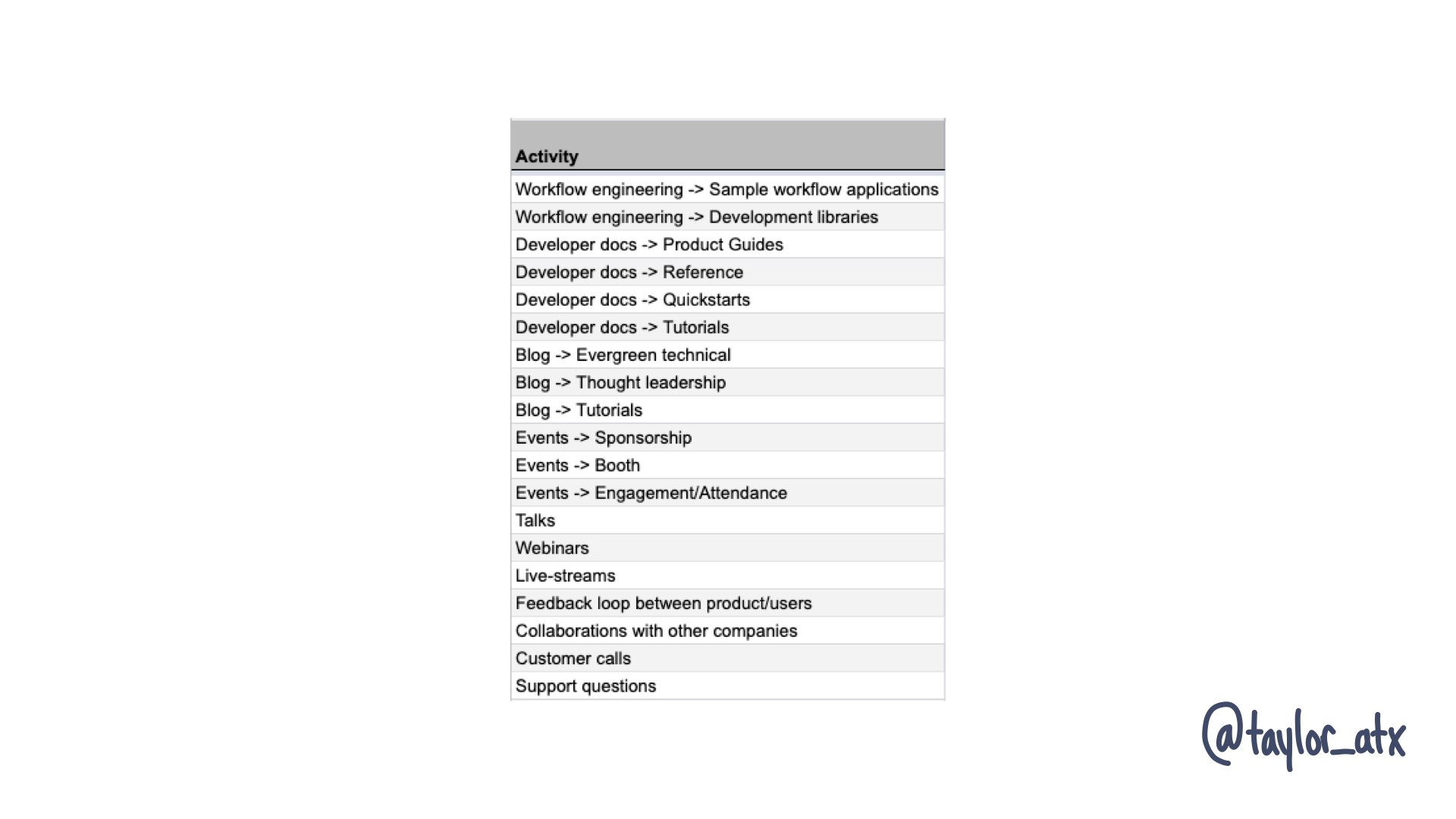 Often one of the greatest challenges in DevRel is prioritization. At any given moment, you could be doing like a dozen different things that somehow work towards your goals. Add in doing this by yourself and it becomes hard mode. It isn't for the inexperienced.